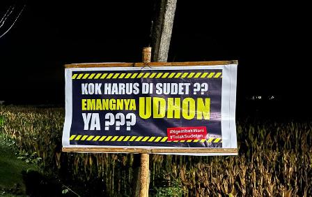 Penolakan rencana pembangunan sudetan di tanah aset milik pemerintah tersebut dilakukan warga dengan memasang sejumlah baner.